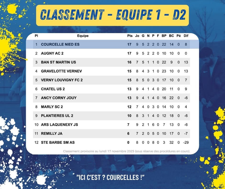 ⚽ L’équipe A occupe provisoirement la première place du classement après sa victoire contre les copains de Marly. Elle profite du match nul entre Augny et Vernéville !
